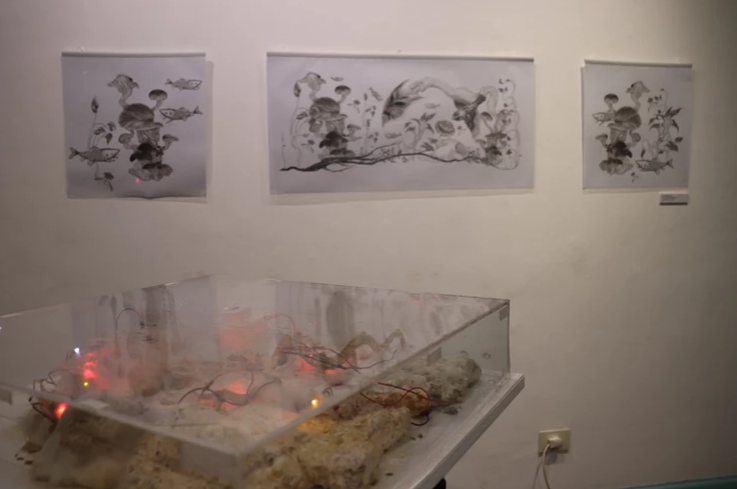 Paisajes Metamórficos es una bio-instalación conformada por una plataforma, un escenario en la que conviven cultivos de hongos junto con criaturas, animales y seres híbridos que se iluminan acorde a índices de supervivencia sensando los hongos.